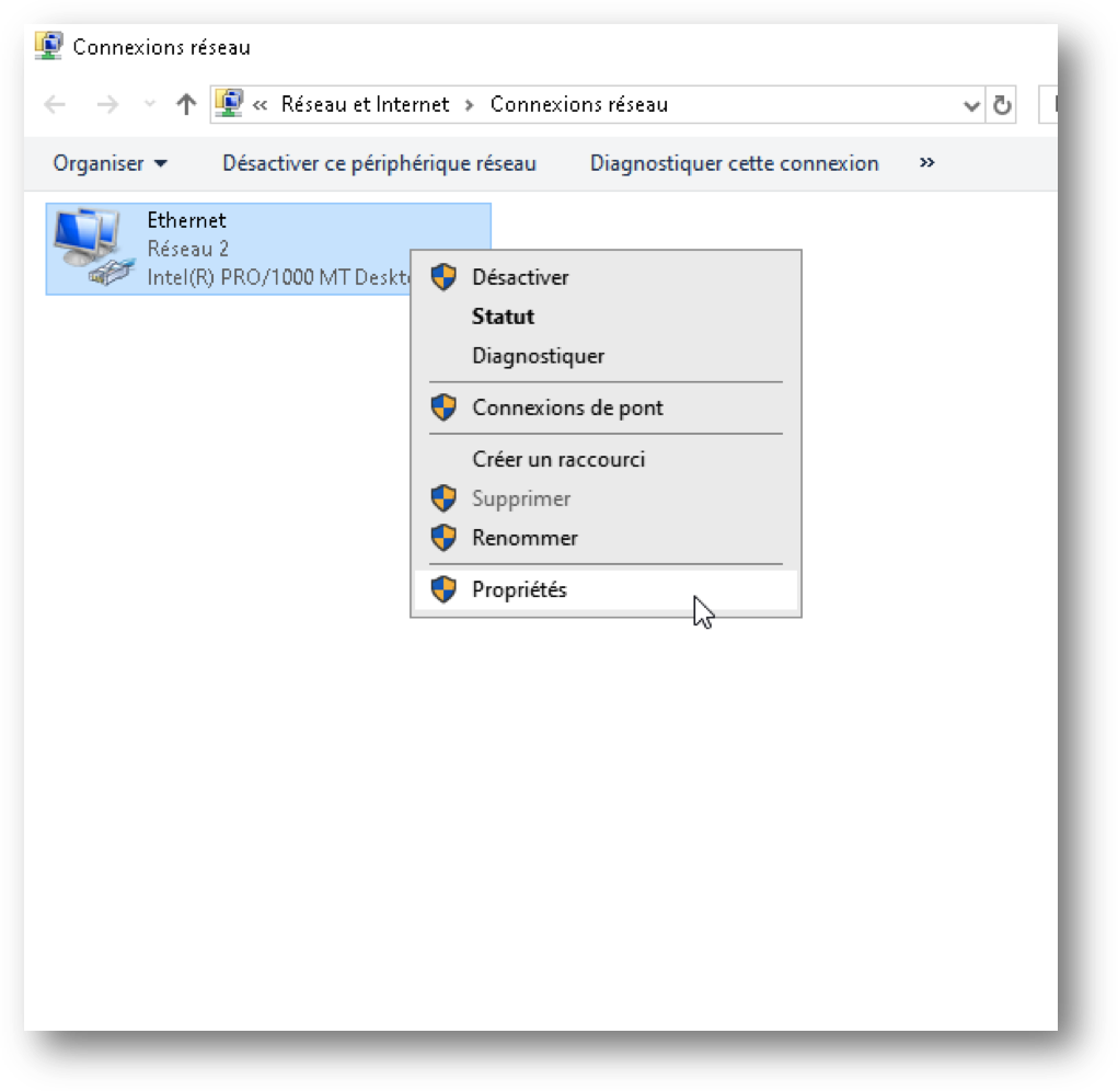 Faire clic droit sur la bonne carte réseau et cliquer sur « Propriétés »