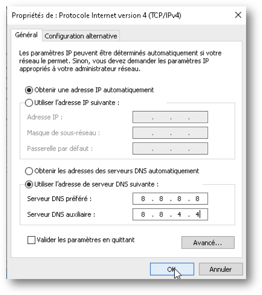 Changer les DNS (ceux de Google vont bien (8.8.8.8 et 8.8.4.4)) et cliquer sur OK.