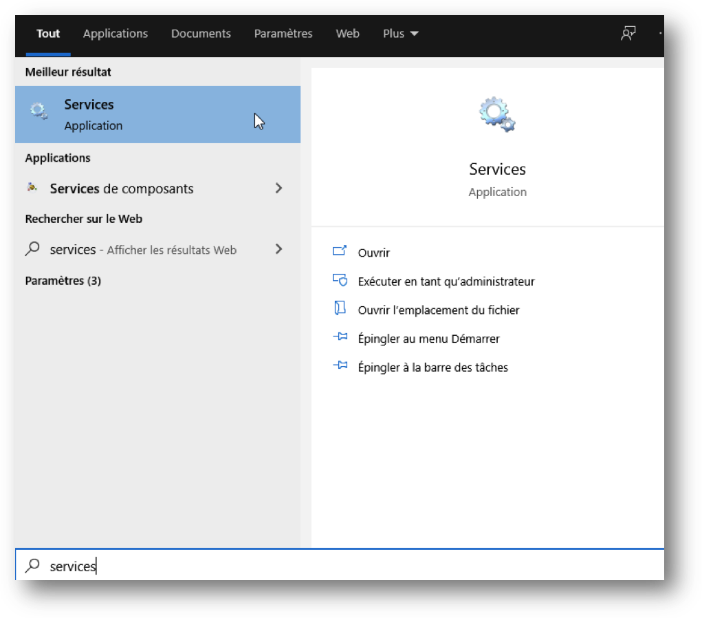Ensuite, dans le menu Windows taper « Services » et ouvrir les Services.