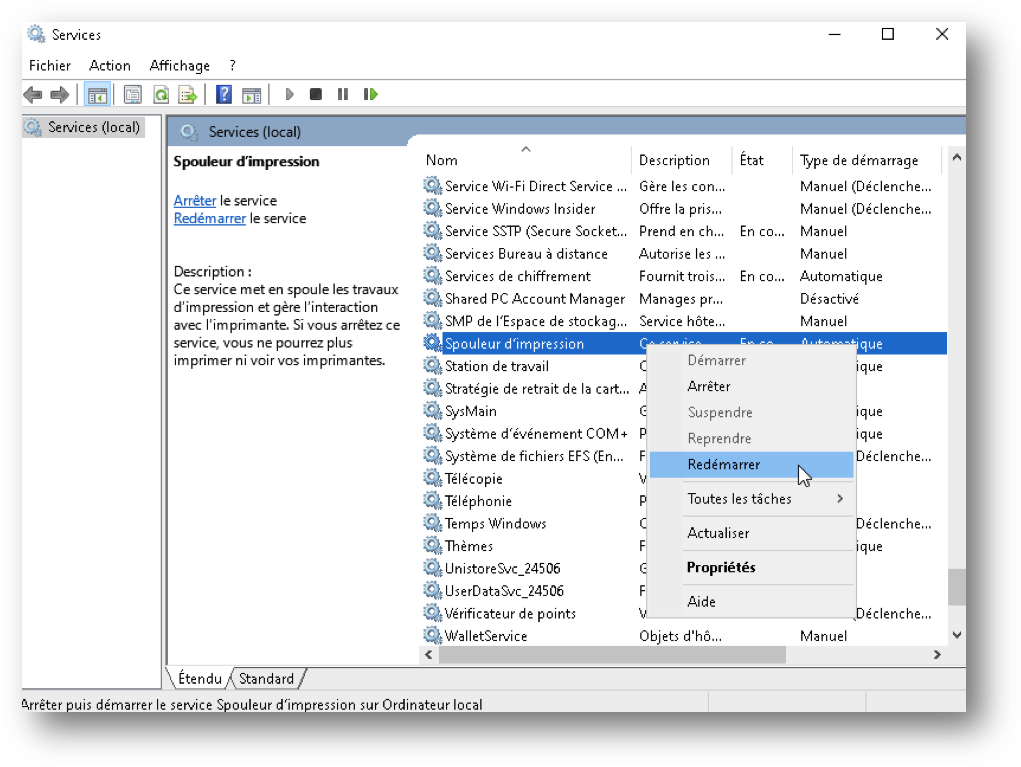 Chercher le service « Spouleur d’impression » et le redémarrer
