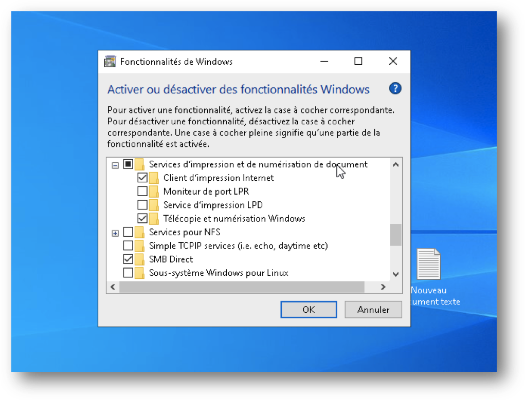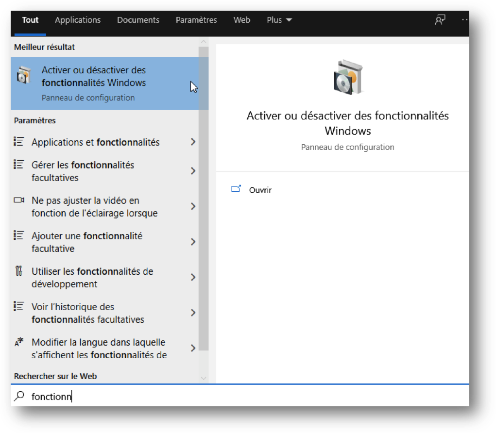 Dans le menu Windows, taper “fonctionnalité” et chercher “Activer ou désactiver des fonctionnalités Windows”